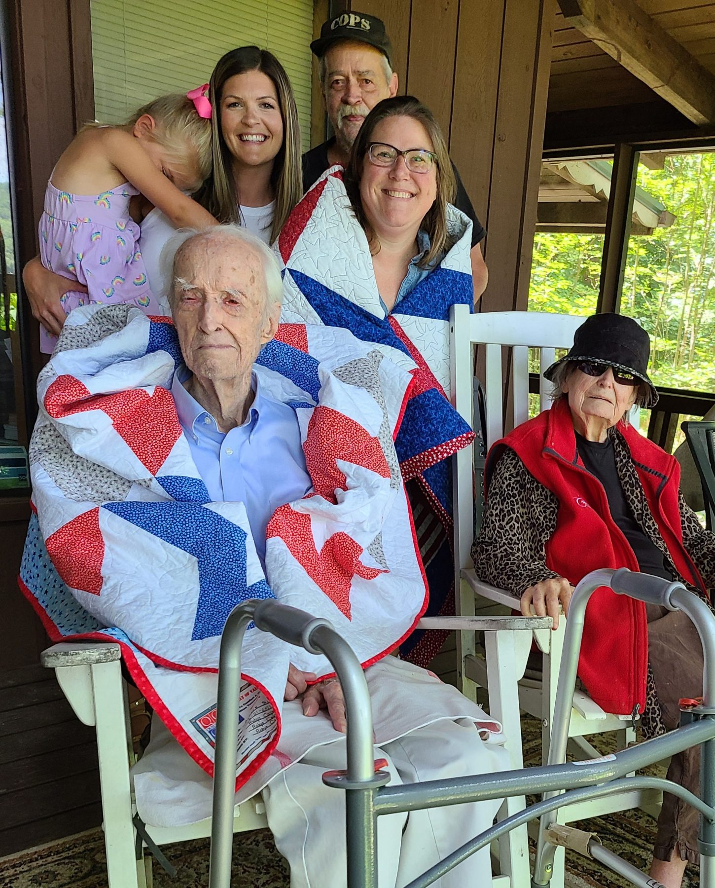 Shannon Kidney with Thomas Sullivan each were awarded a Quilt of Valor. He is sitting next to Shannon’s Grandma Willy.
